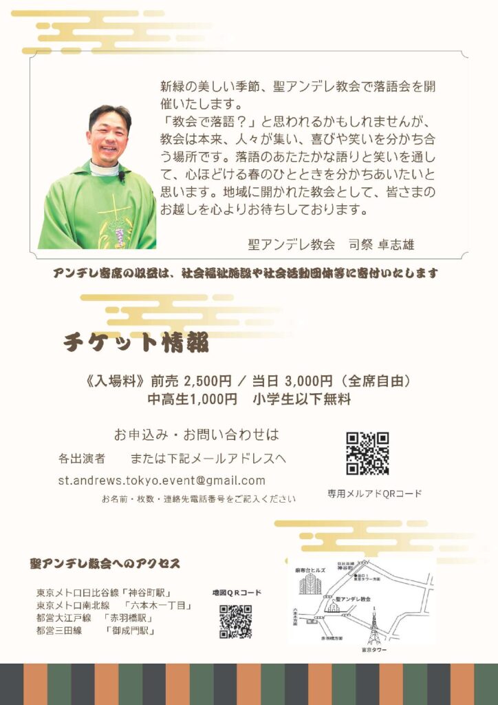 新緑の美しい季節、聖アンデレ教会で落語会を開催いたします。「教会で落語?」と思われるかもしれませんが、教会は本来、人々が集い、喜びや笑いを分かち合う場所です。落語のあたたかな語りと笑いを通して、心ほどける春のひとときを分かちあいたいと思います。地域に開かれた教会として、皆さまのお越しを心よりお待ちしております。